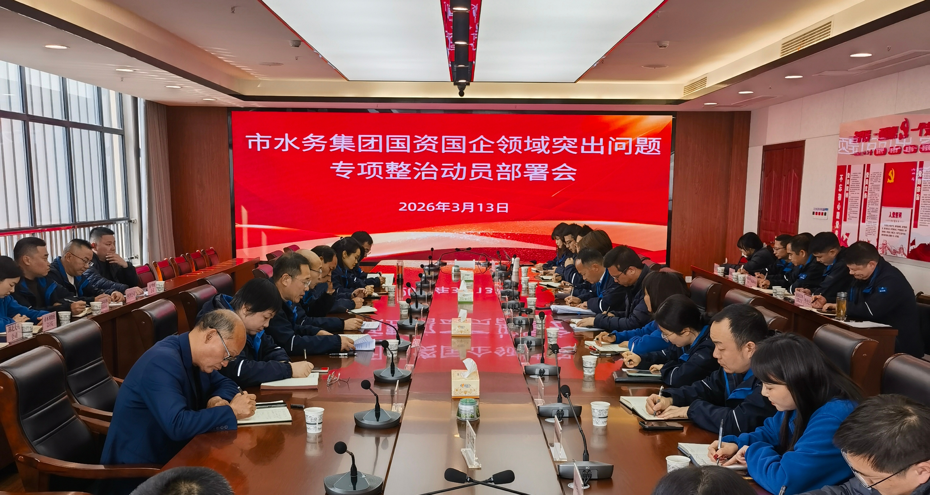 3月13日下午,市水务集团召开国资国企领域突出问题专项整治动员部署会。集团党委书记、董事长陈永根出席会议并作动员讲话,派驻纪检组组长、集团党委委员、纪委书记刘高轶主持会议。集团领导班子成员和各单位(部门)主要负责人参加会议。