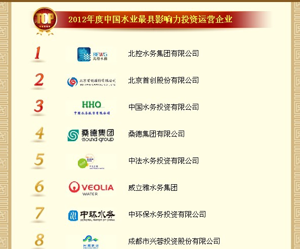 2012年度中国水业最具影响力投资运营企业