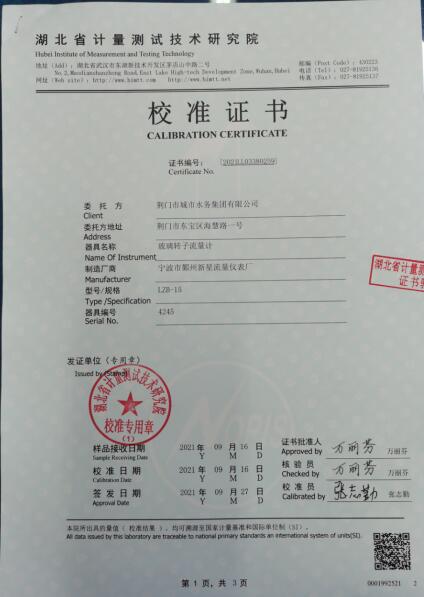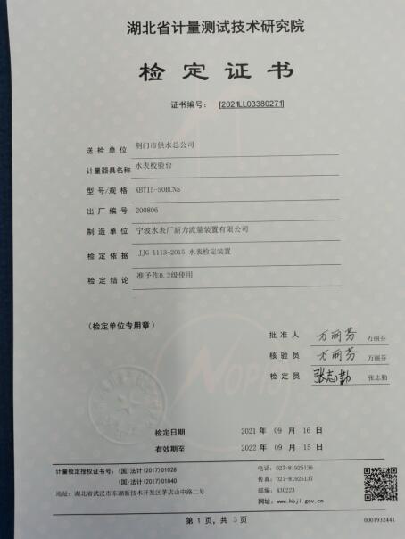 9月15日,湖北省计量测试技术研究院技术人员对水表所3台DN15-50检定装置和1台DN80-200检定装置进行现场检定并进行调试,经检定所有检定装置合格,由省计量院颁发了合格证书,确保水表所计量服务的有效性、公正性。