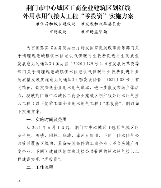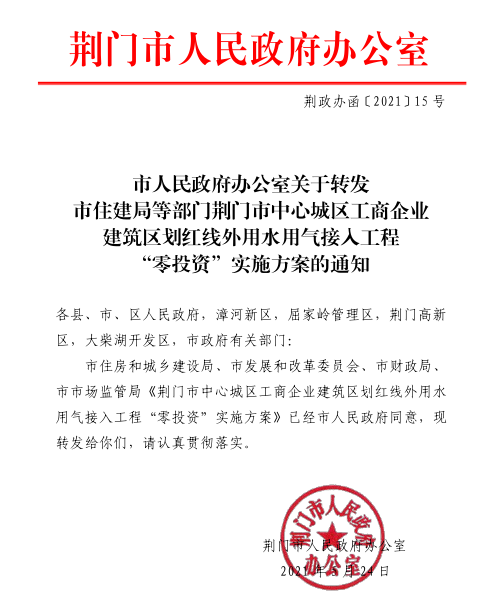 市人民政府办公室关于转发 市住建局等部门荆门市中心城区工商企业 建筑区划红线外用水用气接入工程 “零投资”实施方案的通知
