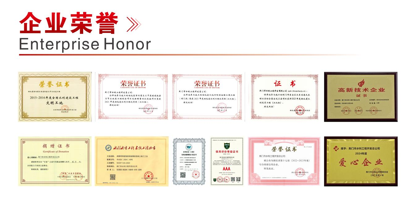 连续十五年获评省市级“守合同 重信用”单位的荣誉称号,连续十三年荣获ISO三体系认证证书,连续五年荣获水利部颁发的全国水利建设市场主体信用等级AAA级证书。先后被国家、省、市主管部门授予全国企业征信系统立信单位、省市水利系统先进施工企业、先进基层党组织、安全生产先进单位等荣誉称号。