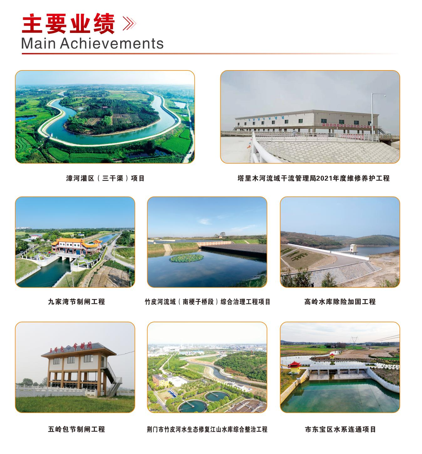 承建的湖北省漳河灌区续建配套与节水改造工程被国家水利部、省水利厅授予“文明工地”称号;承建的湖北省漳河灌区三干渠续建配套与节水改造工程、汉北河防洪治理工程、汉西水系连通工程、东宝区水系连通工程等项目获得“湖北省水利工程优质奖(江汉杯)”荣誉称号。