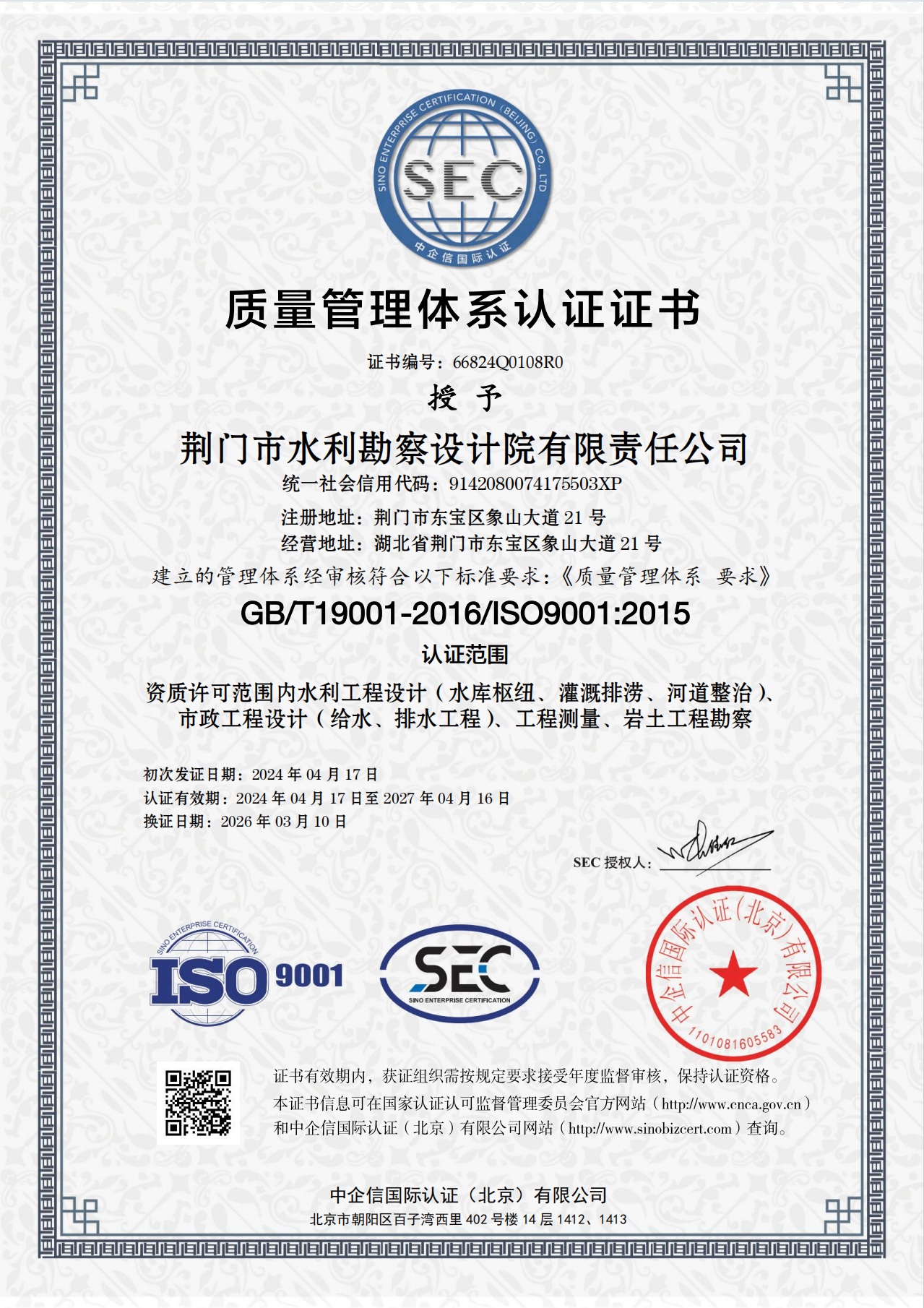 近日,市水务集团下属子公司荆门市水利勘察设计院有限责任公司(以下简称“水勘院”)顺利通过QES(质量、环境及职业健康安全)三体系再认证审核,并新增市政工程设计(给水、排水工程)认证范围,这标志着水勘院从水利工程向市政水务工程领域迈出了实质性的一步。